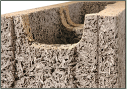Yesterday, I was talking with a potential architect and I asked about lower embodied-energy basement wall systems. She mentioned Durisol, which is basically a type of lightweight block made from cement-impregnated wood waste. Builders stack the blocks (which can be sawn and drilled with standard contractor’s tools), and then fill the interior with reinforced concrete. Here’s a picture of a block emphasizing the texture of the material: