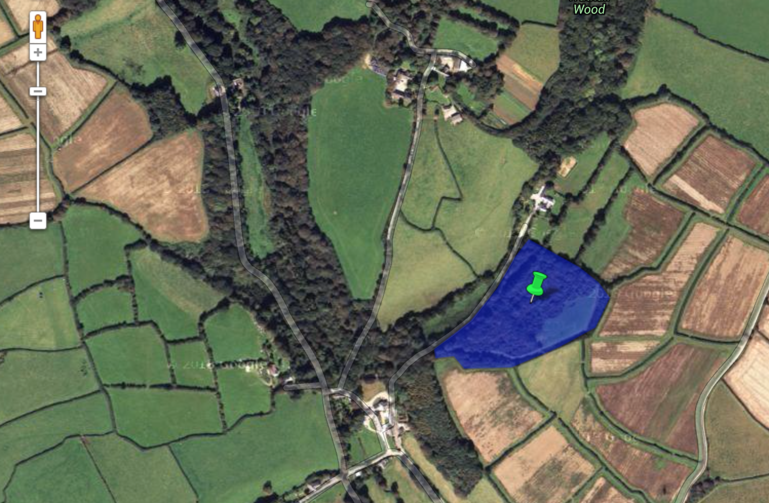 When I first bought Fox Wood just over a year ago, it was an abandoned coppice wood with brambles growing everywhere and some of the trees in a derelict state. The woods were planted about 25 years ago when it was part of the local estate – the Trevarno Estate – which was a big local landowner with family ties stretching back hundreds of years. Locals say it used to be full of pheasants which ‘gentlemen’ would periodically come along and shoot as they were flushed out by drivers. The estate went bust and was sold to a Russian oligarch (so I’m told) and the small parcels of woodland were sold off to individual buyers. Fox Wood is about six acres, with a two acre field attached. You can see it shaded in blue of the Google map image below.