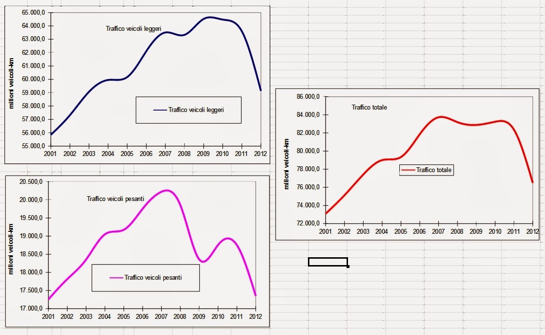 But arriving to the conclusion that there are no problems in Italy would mean to make the same mistake that our former prime minister made a few years ago, when he said that Italy had no economic problems because "restaurants are full". Restaurants are not the economy and city streets at rush hour are not the country’s transportation system. And there is no doubt that transportation is in trouble if we measure it in terms of km traveled. Here are the data (courtesy of Massimo de Carlo at "Mondo Elettrico"). The blue curve is for light vehicles, mainly cars, violet is for trucks, and red is all vehicles. Data from AISCAT, updated to 2012.