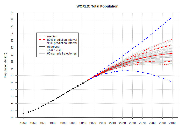 Those dash-dotted blue lines at the margins are the range that would be accomplished if there were half-a-child more or fewer births per woman than at present. Half-a-child smaller families is all it would take to move planetary stress out of the red zone.