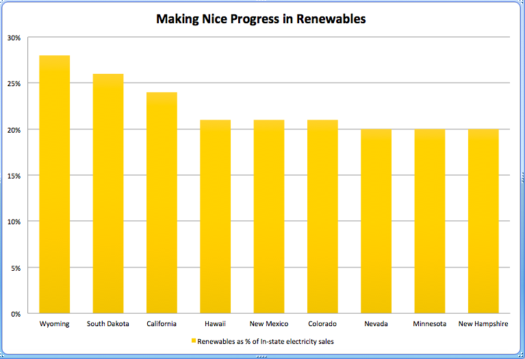 I like to look at renewables as a percent of electricity consumed rather than generated, because if a state generates little of its own power, it may still be responsible for ginormous carbon emissions that it’s simply shoved on to someone else. On the flip side, some states are already meeting a high percentage of their electricity needs via renewables, a fact masked by the large amounts of electricity they generate for export to other states. In addition, locally-produced power means lower transmissions losses, reducing the amount of electricity needed to be generated in the first place.