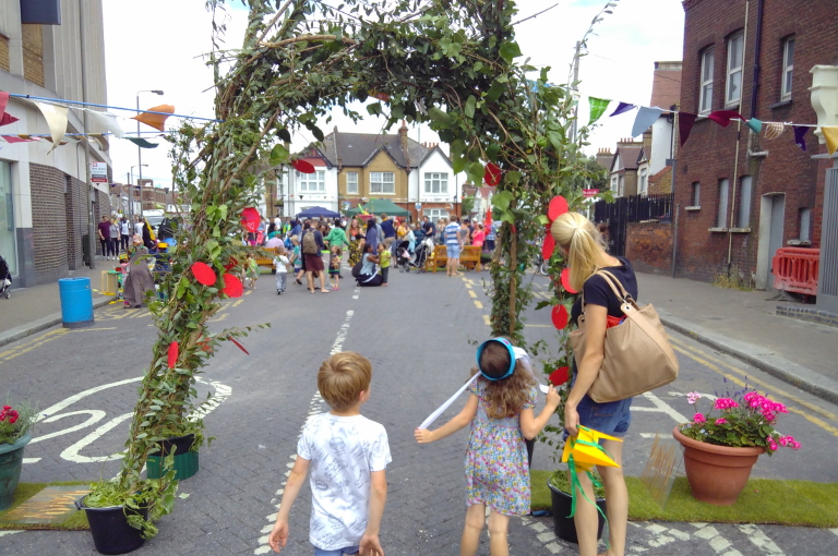 The buses went elsewhere for the day (just down the road), and out came all manner of benches, a kind of speakers platform/viewing platform which was adorned with plants and became a great place to have your photo taken, strips of actual grass rolled out onto the road, trees in pots, bunting, and a beautiful arch for people to pass through as they entered from the High Street. There was music from a ukulele band, some amazing Sikh drummers, and from anyone who wanted to play the instruments that were available. There were wheelbarrows full of plants and twirly windmills.
