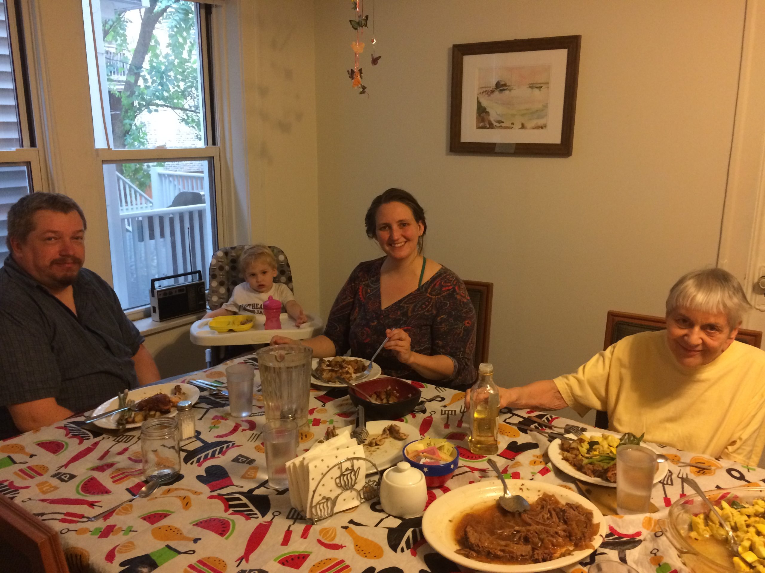 It’s community dinner night at Pat Crowley House. Golden oldies are wafting through the room – Good Vibrations by the Beach Boys, Come Together by the Beatles – thanks to Mike, a young college student who is tonight’s DJ. Ten elders settle into the dining room, passing iced tea and wine, as more young people weave between the two tables, serving heaping plates of chicken, pot roast, potatoes, asparagus, and summer squash. Two-year-old Henry is babbling away in his high chair. Bobber, one of the older residents, turns to his friend Myra and asks if she’s doing alright. “Uh huh!” she says, and she reaches out to give him an affectionate scratch on the back of his head.