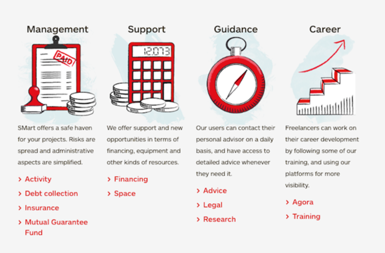 SMart is a social enterprise founded in 1998 in Belgium. The project’s aim is to simplify the careers of freelancers in cities across Europe where SMart operates. These days, there are many freelancer services — cooperatives, coworking spaces, unions — but at the time of its inception, SMart officials were focused on one subsection of this workforce: artists. “That’s how we started,” says Lieza Dessein, a project and community manager for SMart. “What we realize is that a lot of artists have the same kind of issues when they are working. For example, a band would make up a contract. The band would actually pay the musicians with that single contract. And they had very irregular revenues.”