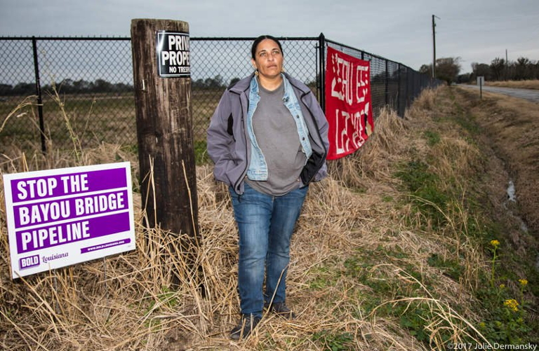 Main image: Cherri Foytlin at the entrance to her new land which the Bayou Bridge pipeline is slated to cross. Credit: Julie Dermansky