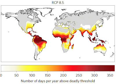| On the current high-emissions scenario (RCP 8.5), most of the tropical zone experiences many months each year of deadly heat, beyond the capacity of humans to survive in the outdoors. Source: Global risk of deadly heat |