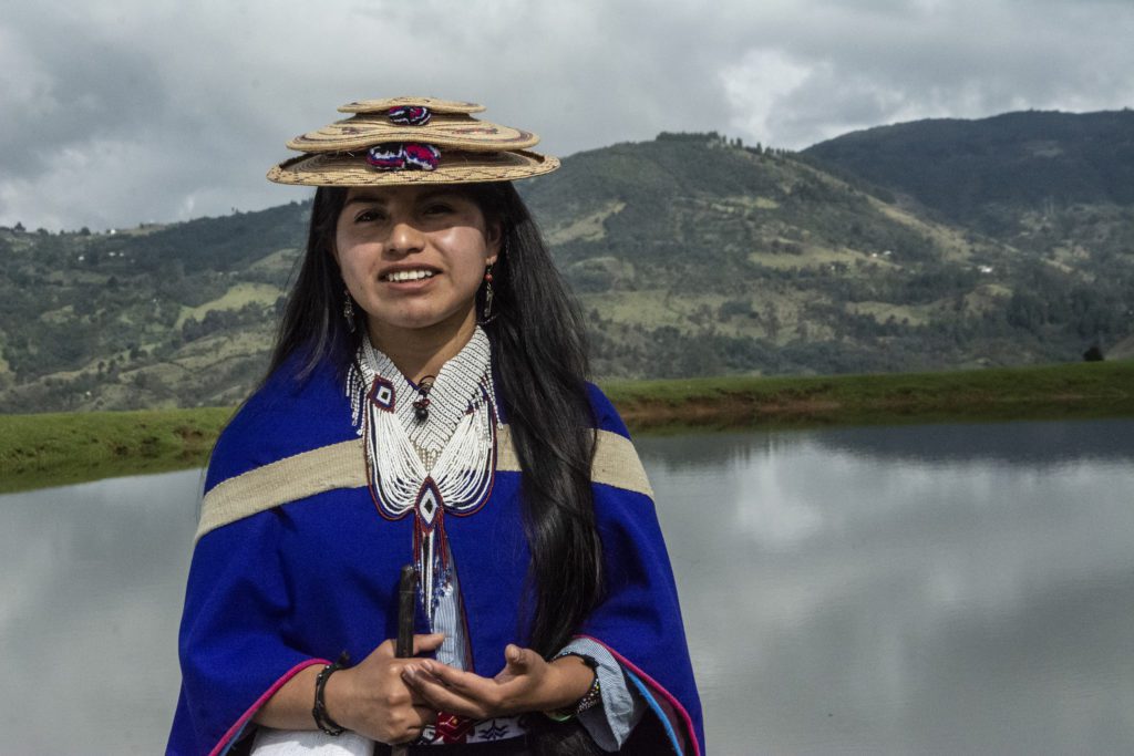 Diana Mery Jembuel Morales, Misak journalist, wears the atuendo, or traditional dress, of her people. Her traditional hat, called a tampaldkuari, has the form of a spiral, symbolizing the cycle of life. The blue shawl represents tranquility, and the fuscia trim represents the blood shed by the ancestors who fought to defend the territories. (Esperanza Project/Cosmology & Pandemic)